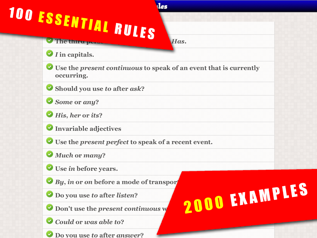2000个例子,100个基本英语规则,20个级别,3个学习模式。