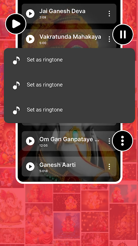 获取所有最好的 Ganesh 铃声收藏,如 god ganesh aarti、ganesh mantra、ganesh Stuti、gajanana shree ganaraya、om ganpataye namah、ganesh Visarjan、ganesha ashtakam、shree ganeshay namah、ganpati aayo bapa rodhi sidhilayo、ganpati chalisa、 ganpati thal、jai ganesh jai ganesh deva、pratham shree ganesh besado、deva shree ganesha、shambhu sutaya、ganpati bapa morya 和其他 ganpati 铃声。