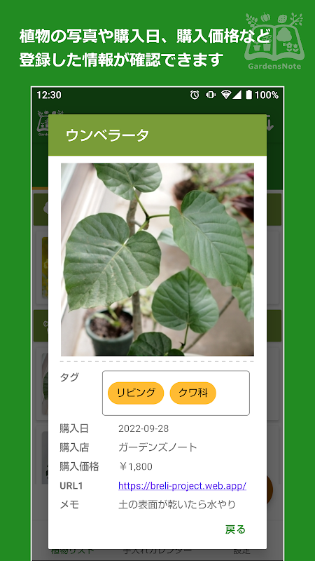 · 触摸植物列表,显示照片、购买日期等注册信息