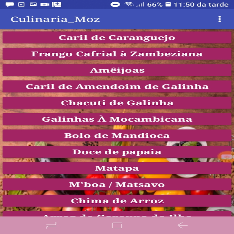 Um aplicativo feito para moçambicanos para ajudar a explorar a culinária moçambicana, fornecendo diversos pratos que até então são desconhecidos por Moçambicanos e estrangeiros.