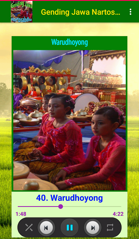 Dihadirkan aplikasi yang berisi lagu Gending Jawa terbaik dari Ki Nartosabdho seperti Arum Manis, Jurang Jugrug, Ladrang Ubaya Pl.6, Rondha Kampung,Lesung Jumengglung, dll. Semua Gending Jawa disajikan dalam audio offline berkualitas yang dilengkapi dengan fitur Ringtone. Aplikasi ini diperuntukkan bagi para penggemar seni budaya Jawa khususnya musik traditional Jawa. Install dan nikmati keaslian seni musik daerah Java Dwipa. Nikmati merdunya nyanyian para sinden yang diiringi gending jawa.