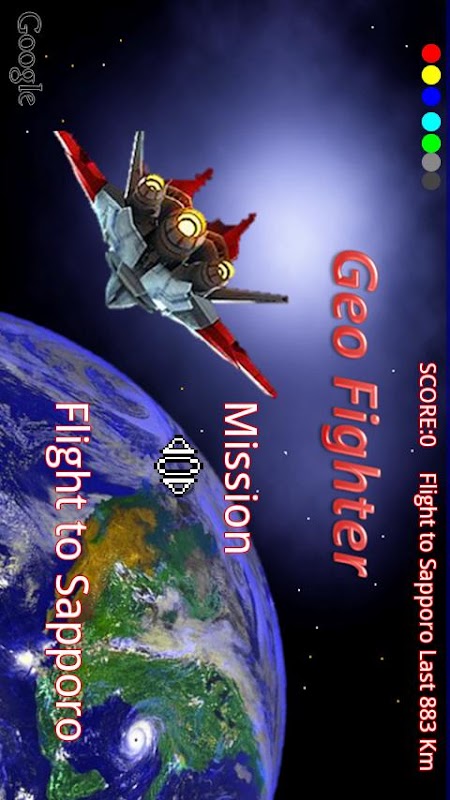 This is a Shooting Game to fly on the GoogleMap. The goal is to arrive in the specified area. You can destroy the enemy fighters with missiles.