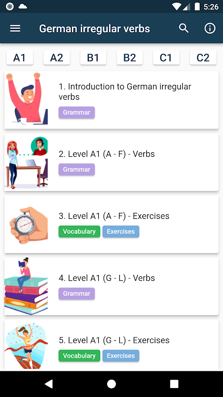在此应用程序中,您将找到超过 200 个不规则德语动词,以及 Präsens、Imperfekt 和 Perfekt 格式的翻译、音频发音和形式,以及德语 Perfekt 时态的助动词。该应用程序包含超过 600 个英语例句 - 您将看到例句中每个动词以三种不同时态的用法。学习材料分为 56 个子章节,对应于特定的语言熟练程度。动词按级别划分(从 A1 到 C2)。 A1、A2、B1 级动词的划分符合歌德学院的要求。 B2、C1、C2级别的动词是根据我们自己的广泛经验来划分的。德语不规则动词是适合各个语言水平的应用程序。