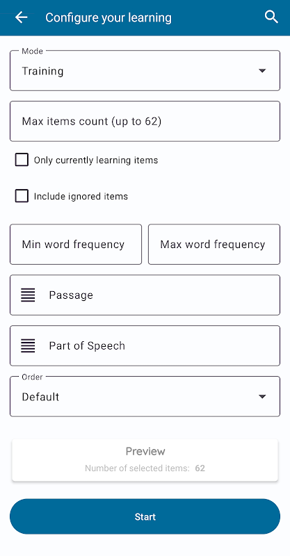 • 定制培训:根据您的具体需求调整培训,随心所欲:选择学习模式、段落、词性、事件等。