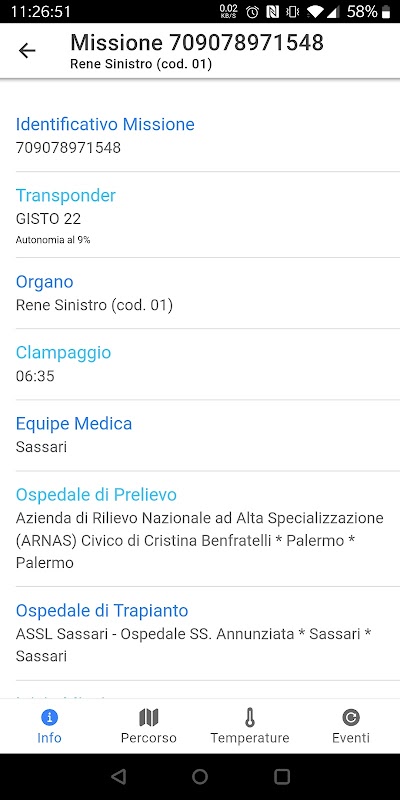 GistoApp 列出了过去 24 小时内正在进行的运输任务,并为每个任务显示旅行路径、器官温度图、任务状态。