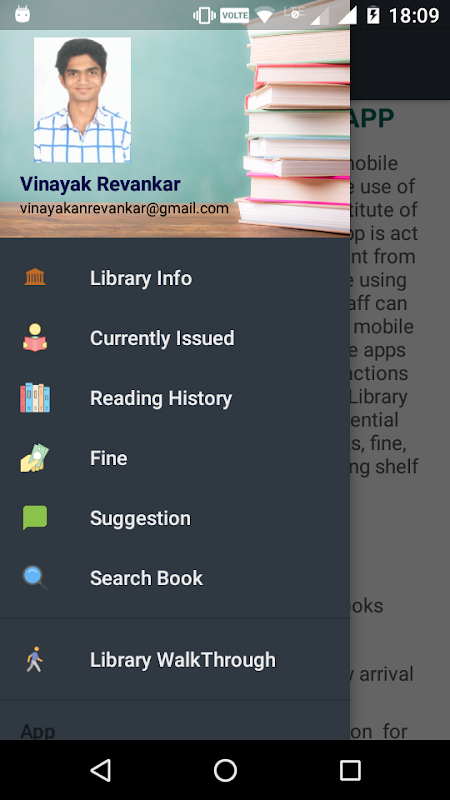 该GIT库的应用程序是唯一的移动应用程序的设计和供学生使用的和工作人员的技术,Belagavi的KLS Gogte研究所开发的。移动应用程序是像一个插件,并取出由现有的使用在图书馆高波自动化软件的内容。 Git的学生和工作人员可以使用OPAC的登录凭据登录移动应用程序。保持到记住,通常使用的移动应用集中在十五分钟或更少的简短交流。该GIT图书馆的应用启用了基本信息的快速视图,例如 - 发行图书,罚款,阅读历史,并沿货架位置项搜索。