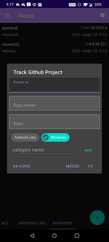 可以手动添加存储库 URL、扫描二维码或从浏览器共享。