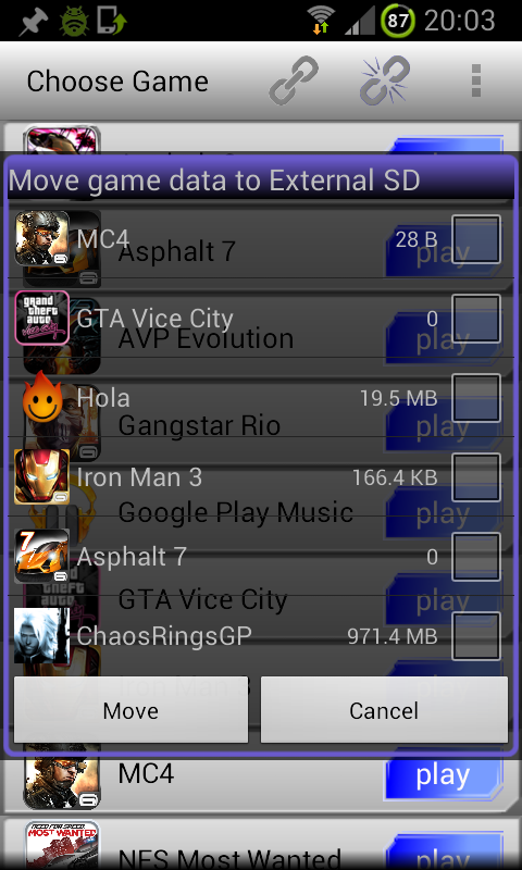 1.新使用者请用"移动资料"功能,勾选你要移动的游戏资料,将资料移动到外部SD