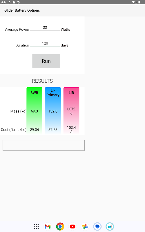 计算三种不同电池选项的质量和成本