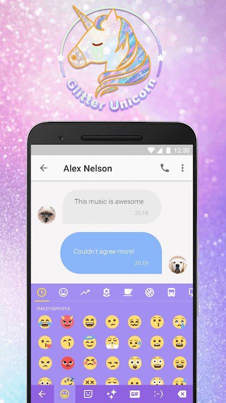 This Glitter Unicorn Emoji Keyboard Theme is customized for Facemoji KeyboardFacemoji Keyboard + GIFS. Please click the link to have it installed first.