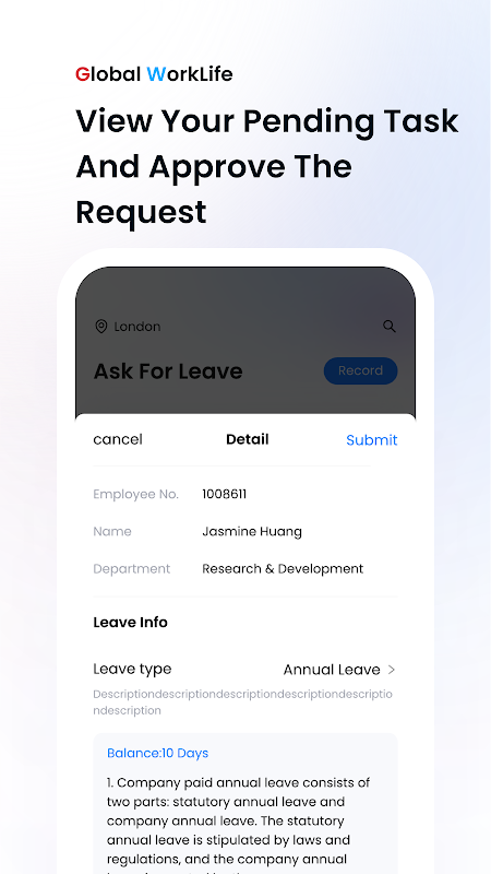 Global Worklife is a powerful app developed by CDP Group.It offers a seamless way to manage work and personal life, no matter where you are in the world. With decades of experience in global expansion, CDP delivers a Technology-enabled, End-to-End SaaS + Service, including Hiring,EOR, Payroll&Tax, mobility, HRO and Advisory services, designed to cover customer Full Life-cycle during globalization.