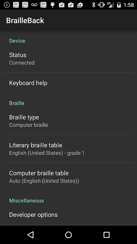 • 如果您的蓝牙盲文显示屏未配对,请确保显示屏处于配对模式,然后通过蓝牙设置选项完成显示屏配对。