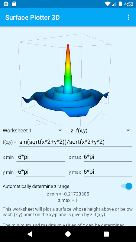 该应用程序基于工作表,用户可以在其中定义函数,然后绘制相应的曲面。每个工作表可以定义形式为 z=f(x,y) 的实函数、形式为 z=f(x+iy) 的复函数、形式为 x=f(u,v)、y=g(u,v)、z=h(u,v) 的参数函数、形式为 f(x,y,z)=k 或 f(r,theta,phi)=k 的标量场函数,或基于随机种子的分形景观。绘图所用的坐标和参数范围也在工作表中定义,坐标范围是由应用程序自动确定还是由用户手动输入也由工作表定义。后者功能对于控制显示的绘图区域非常有用。