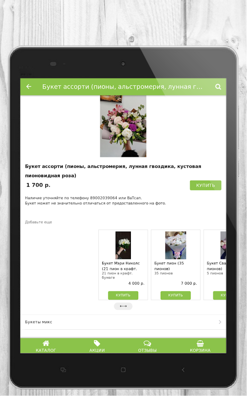 Через приложение Вы можете выбрать и заказать цветы с доставкой, а также оформить самовывоз на определенную дату и время. Для Вас доступен каталог наших товаров: цветы, букеты, композиции, игрушки и декор. Установив приложение, Вы всегда будете в курсе наших акций и новинок!