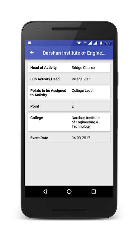The GTU 100 Activity Points app will help students to record and view the points they have earned based on the activities done during the academic term. To use the app you need to select Major Head of Activity first. Then select sub-major activity head. Based on the selection made, you need to select the level of activity you participated. At last, enter the name of college where you participated and date of the event. Submit it. In the Result menu, you will be able to see the score you acquired for the activity you participated for.