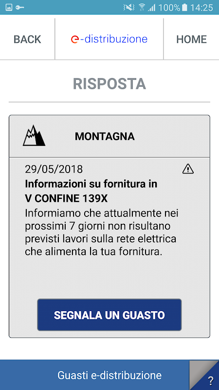 Nel caso in cui non ci siano dei lavori e/o guasti in corso per la fornitura in oggetto, tramite il pulsante “segnala un guasto”, potrai segnalare la presenza di una disalimentazione. Ti verrà quindi sottoposto un questionario, necessario per l’inserimento e la corretta gestione della segnalazione. A seguito della compilazione, ti verrà comunicato l’esito della richiesta. Notifiche SMS ti informeranno inoltre sullo stato della segnalazione.