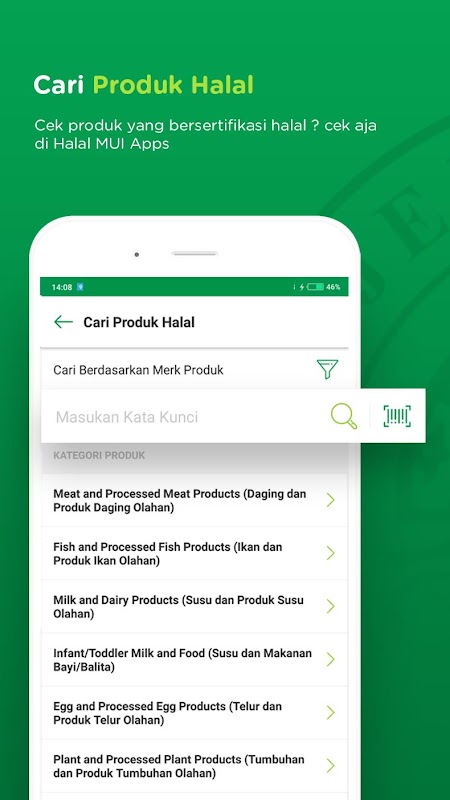 - Search halal products by name, manufacturer, certificate number or product barcode (scan barcode using camera)