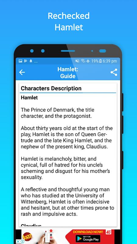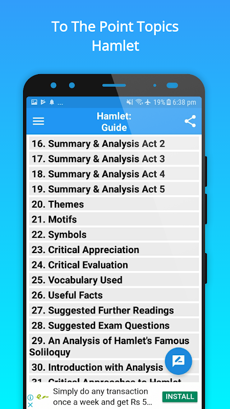This Guide app works both online and offline, and contains 35 basic topics about one of the famous plays of William Shakespeare, Hamlet.