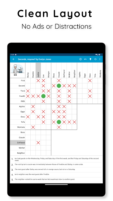 正在寻找更难的谜题?例如七格网格?试试我们的逻辑谜题应用程序,其中包含 Puzzle Baron 的谜题。
