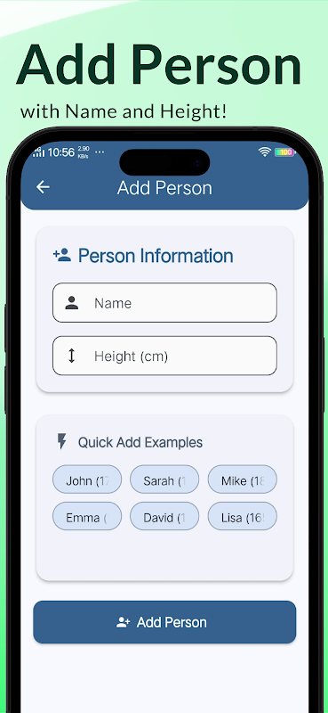 按姓名、性别以及以英尺/英寸或厘米为单位的身高添加人员,并查看他们的身高对比情况。