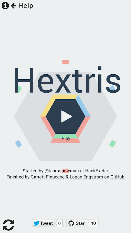 HEXTRIS is a fast paced puzzle game inspired by Tetris. Blocks start on the edges of the screen, and fall towards the inner blue hexagon. The objective of the game is to prevent the blocks from stacking outside the area of the grey hexagon. To do this, you must rotate the hexagon to collect different stacks of blocks on each face. Aim to connect 3 or more blocks of the same color. When they match up, those 3 blocks are destroyed, and the blocks above them slide down. Destroying multiple series of blocks grants combos, whose durations are indicated by a quickly receding outline around the outer hexagon. You lose once a stack forms outside the outer boundary!