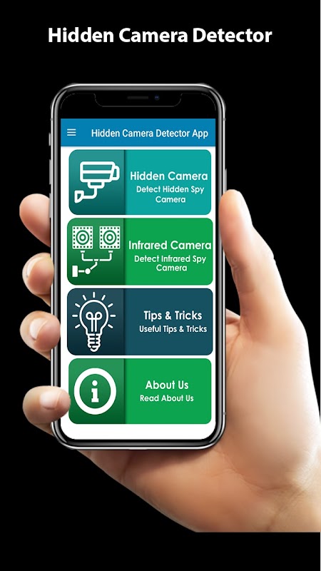 隐藏式摄像机检测器和设备检测器可让您通过使用此应用程序的“摄像机检测器”功能或感应电子设备的磁场来检测周围环境中的隐藏摄像机和设备。
