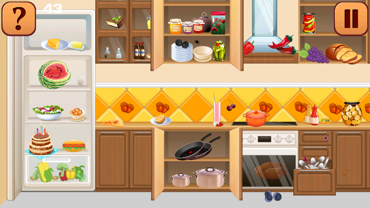 Welcome to your own kitchen! Unfortunately, there is little chaos here, try to find everything you need here! Are you good enough in finding objects? Test it now with Hidden Things Kitchen. You also can use this game to learn colors and shapes with your child, in this restaurant game there are many colorful objects of different shapes, discover new fruits and vegetables in this kitchen scramble game!