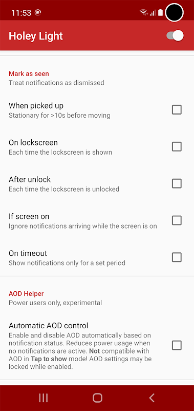- 辅助功能:应用程序需要辅助功能服务来在屏幕上呈现模拟 LED,并跟踪正确的位置以在屏幕“关闭”模式下显示。