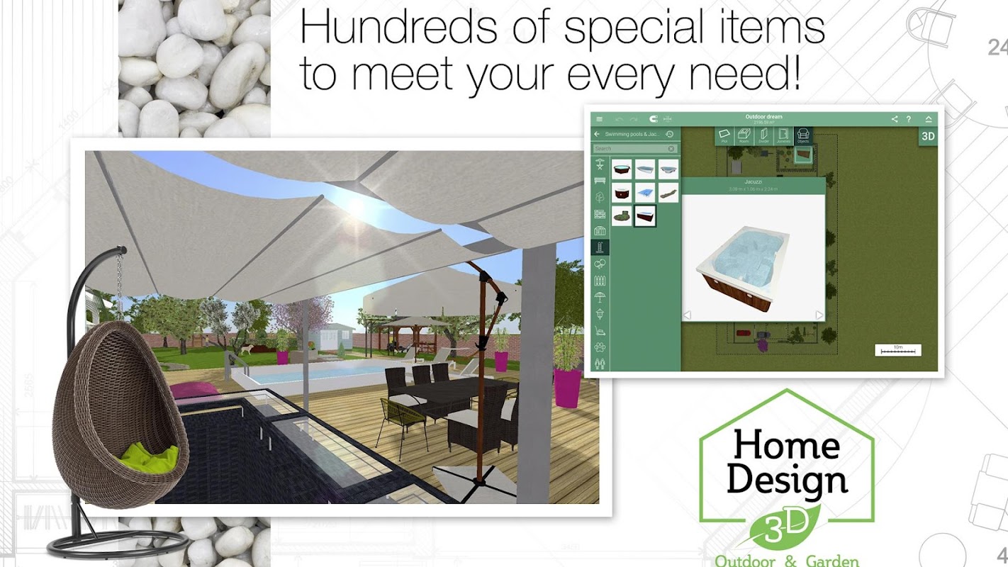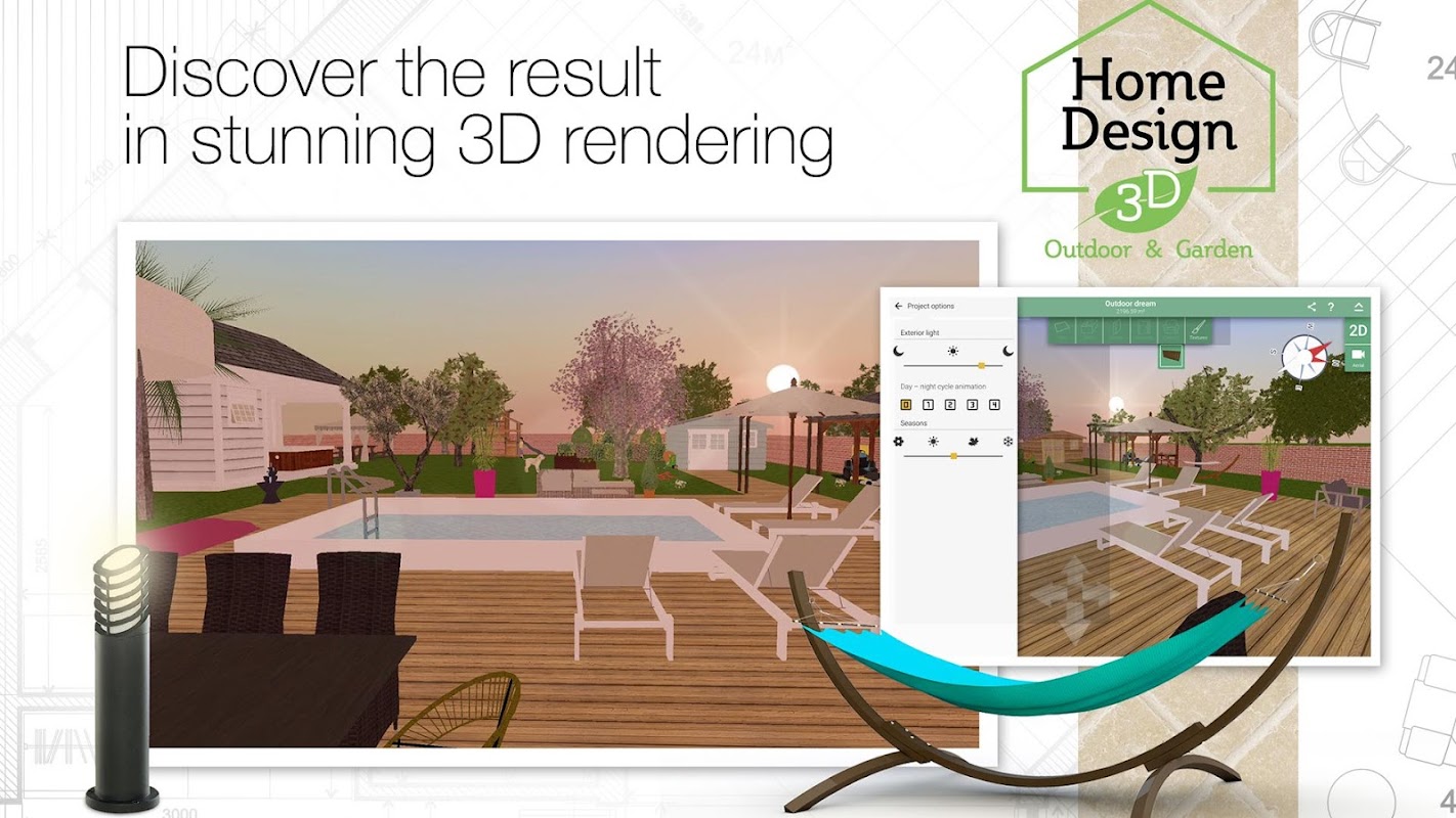 凭借全新的 3D 渲染,Home Design 3D Outdoor/Garden 将帮助您快速、轻松地实现您的设计梦想,无论您有什么想法:设计您的花园、提出您理想的户外空间、创建一个游乐区、组织您的露天婚礼和更多!
