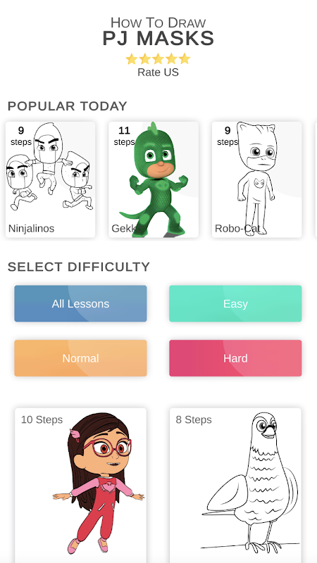 如果您是令人兴奋的关于学童的 PJ 英雄卡通的粉丝,并且一直想画出所有的角色,那么这个应用程序就是为您准备的。它将有助于回答这个问题:如何逐步绘制 PJ Hero 角色?特别是为您,我们收集了大量的绘图教程,可以帮助您绘制任何 PJ Hero 卡通人物。