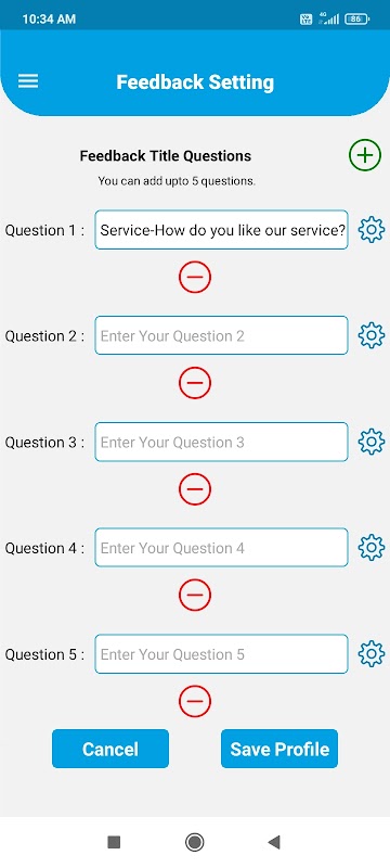 该应用程序提供了在线下商店提供评论和反馈的便利。该应用程序在互联网上在线运行。应用程序支持不同的屏幕,如手机屏幕、9英寸和10英寸标签屏幕、15英寸大显示屏等。它具有不同的问题输入选项、反馈输入选项启用/禁用和跳过问题功能。该应用程序可以根据任何企业的应用程序设置来定制。