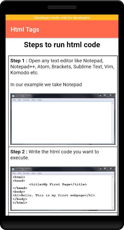 In this app,there is a sequence of steps like types of editor to use, code to be write, how to save the file or which extension to be given etc needed to develop HTML pages.