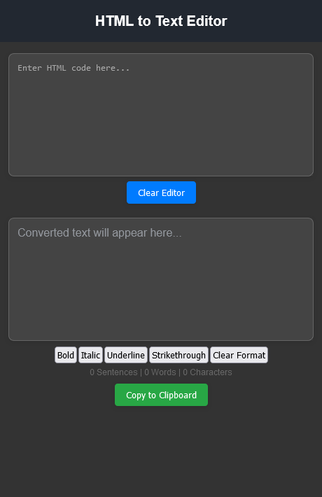 欢迎使用 HTML 到文本转换器 - 这是一款一流的工具,旨在轻松地将 HTML 内容转换为纯文本,彻底改变您处理数字内容的方式。借助 HTML 到文本转换器,告别手动转换的麻烦,并采用无缝自动化来满足您的所有文本提取需求。如果您正在寻找功能强大的 HTML 到文本转换器,那么您来对地方了。这个应用程序将帮助您立即将 html 转换为文本。您无需单击任何地方。只需粘贴您的 html 代码,它就会立即转换,没有任何麻烦。