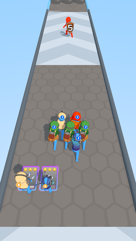收集所有卡牌,并在士兵生成区观看它们从卡牌变成士兵。通过射击面前的稻草人来填充左侧的进化条,并使指挥官进化!