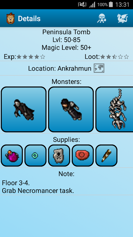 The app gives locations, recommended supplies and fast-access to the tibiawiki page incase you want further information.