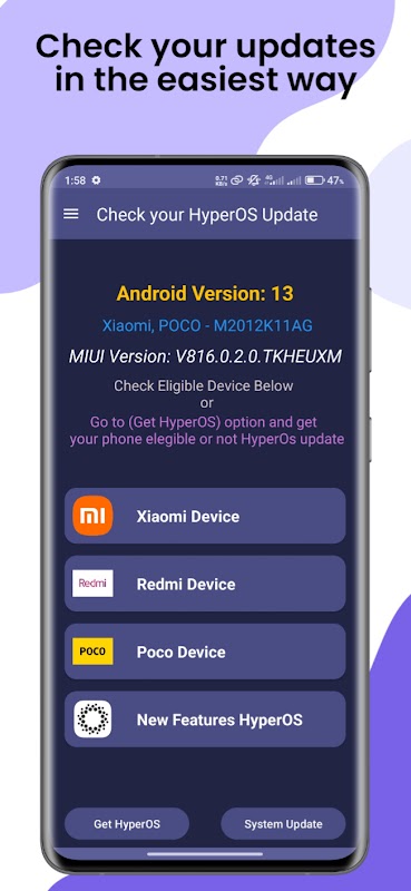 如果您想检查您的手机是否会收到 HyperOS 更新,此应用程序非常适合您。其中包含未来将收到更新的手机型号列表。您可以了解 HyperOS 中的新功能。此外,此应用程序将帮助您更新手机的系统。您还可以查看手机的各种内部信息。