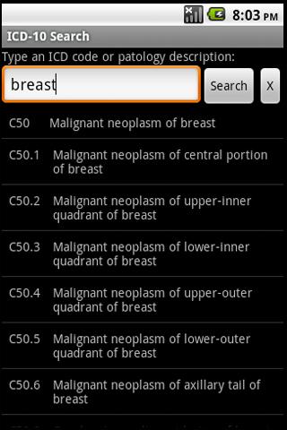 Search through all subcategories of WHO's International Statistical Classification of Diseases and Related Health Problems (ICD-10). You can search using ICD codes or patology descriptions.