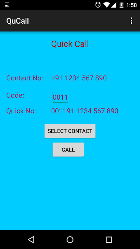 Using this application you can select the contact from contact list and with a click of button the prefixed number i.e 0011 911234567890 (code contactNumber) will be called.
