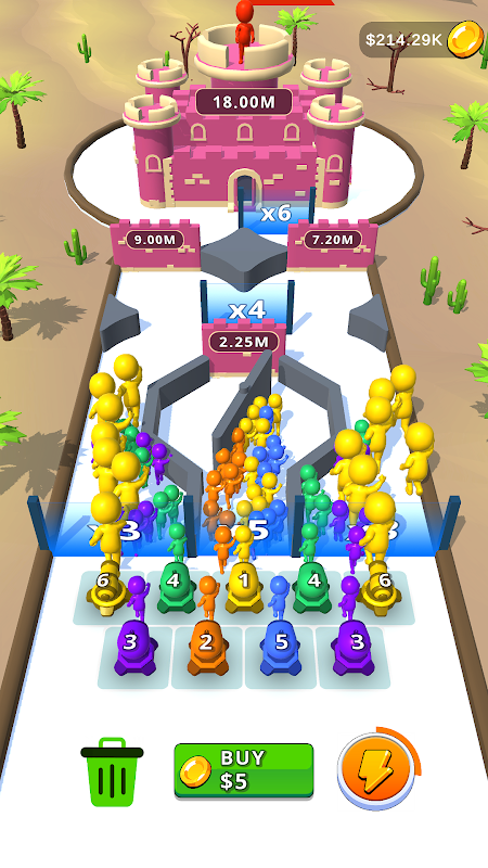 欢迎来到《放置攻击3D》。在这款令人上瘾的手机游戏中,用大炮射击角色。收集金币并购买更多大炮。合并大炮以增强其威力。快速点击屏幕以加快射击速度。摧毁防御工事,最终摧毁城堡。