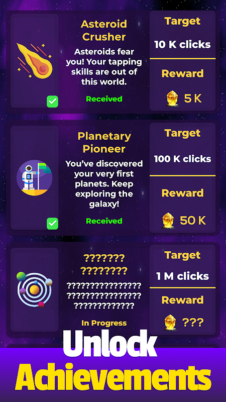✅ 争夺荣耀 – 在排行榜上名列前茅,成为银河系中最棒的点击游戏玩家!