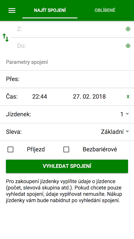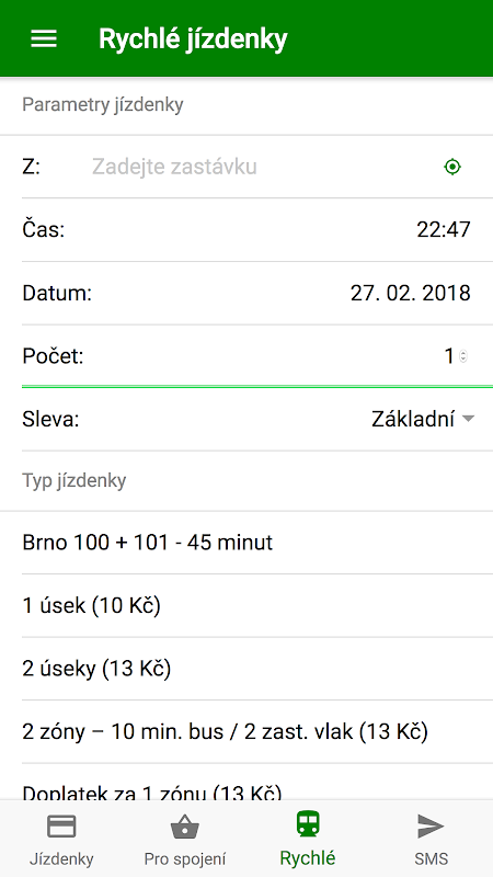 应用程序本身认为必要的连接,并认为,作为旅途需要的车票。只要选择票价和确认的类型。门票双重的 - 无论是对一个特定的路线(我的票)左右发出快速的门票,这是从一个特定的区域只发出了一定数量的区域。这两种费用是相同的。