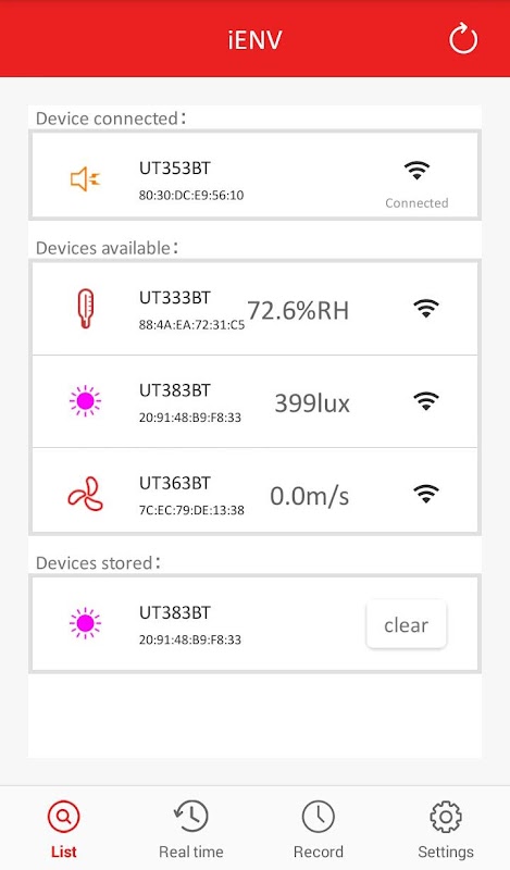 iENV is an App which connects UNI-T’s mini environmental series meters to a cell phone through Bluetooth. It is a free App which can be downloaded from Google Play or UNI-T’s website at www.uni-trend.com. iENV is able to display and record real-time temperature/humidity, noise level, wind speed, and light intensity through UNI-T meters UT333BT, UT353BT, UT363BT, and UT383BT respectively. iENV’s user manual comes in languages of English, French, German, Spanish, and Chinese. Please note this App only works with UNI-T devices mentioned above. For further inquiries on UNI-T’s mini environmental BT series, please visit www.uni-trend.com.