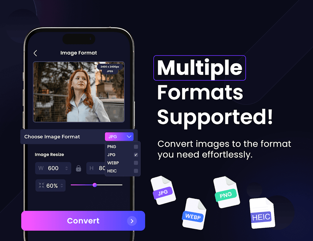 + 从 JPG、PNG、WEBP、GIF、JPEG 或任何格式转换照片。