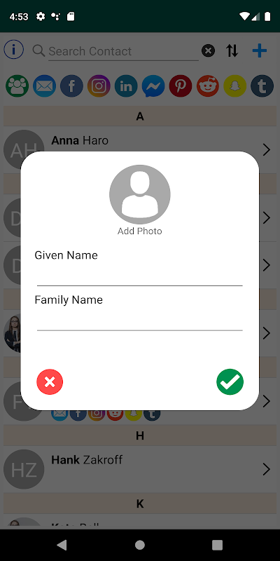 使用您的联系人,您可以非常轻松地向他们添加多个社交网络ID。完成后,社交网络上的简单clic将直接带您到页面或消息。