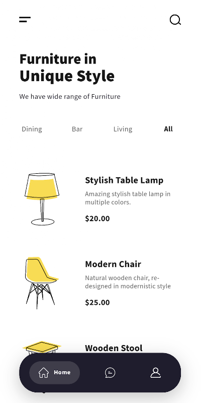 Inspired by design from Ghulam Rasool. Original reference can be found on the following link: https://dribbble.com/shots/14011931-Furniture-Mobile-APP