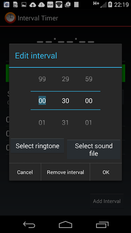 间隔定时器可以让你设置报警,在不同的时间间隔和不同的声音效果,使其成为理想的锻炼。每个间隔可以有其自己的通知声音 - 的预定声音效果或者任何想要的音频文件的任何一个。