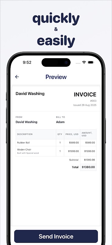 • 专为每天发送专业发票的承包商、自由职业者和小型企业设计