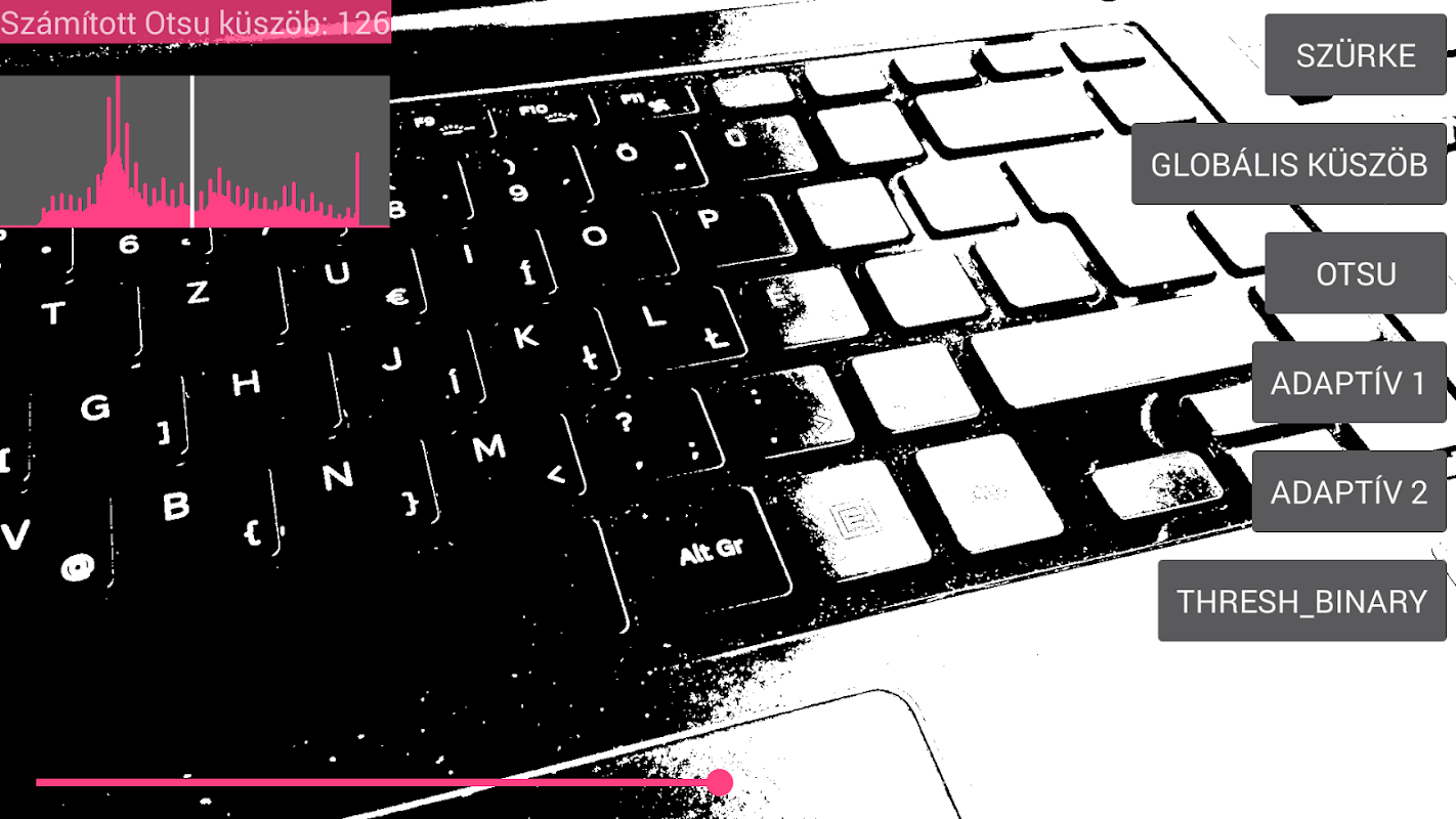 这个应用程序的可视化OpenCV库的阈值函数。我们可以从原来的灰度实时查看,全局阈值与交互选择的阈值,采用大津法全局阈值,和两种类型的自适应方法中进行选择。原始灰度图像的实时取景直方图还示出。这里的白线表示实际阈值。在自适应情况下,阈值被计算为每个单独的像素。