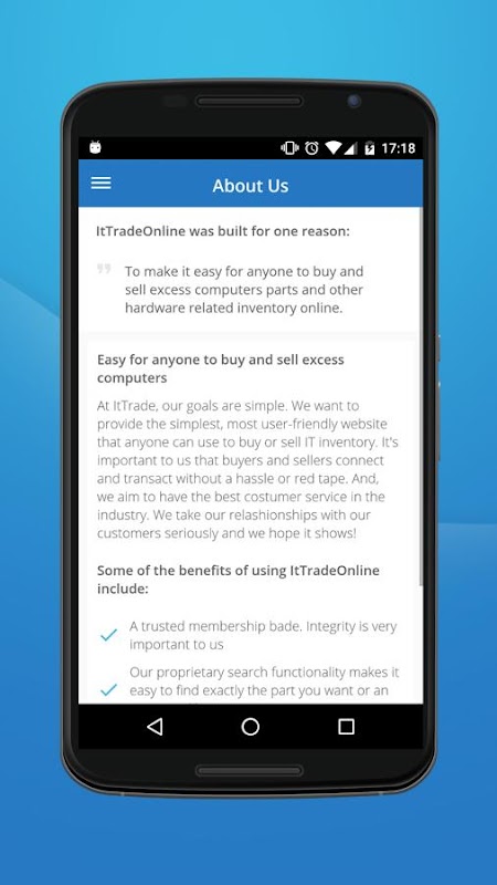At ItTradeOnline, our goals are simple. We want to provide the simplest, most user-friendly website that anyone can use to buy or sell IT inventory. It's important to us that buyers and sellers connect and transact without a hassle or red tape. And, we aim to have the best costumer service in the industry. We take our relashionships with our customers seriously and we hope it shows!