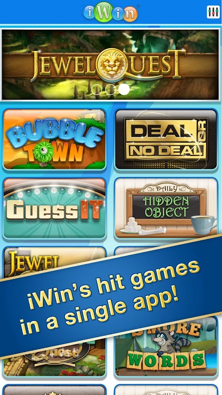 Now you can play iWin's most popular free games right from your Android smartphone or tablet with the official iWin app! This app offers many of iWin’s top games including Jewel Quest, Deal or No Deal, Bubble Town, Mahjong Quest and many more. Best of all, these games are absolutely free! That is right, no in-app purchases or limited trials! Play to your heart’s content anytime, anywhere.